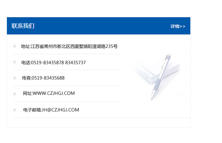 地址:常州市新北區友邦商務大廈1幢16、17層  電話:0519-85101652  傳真:0519-85112595  郵編:213022  網址:www_cz-jiayue_cn.mytb888.com  郵箱:xiajifengaa@163.com